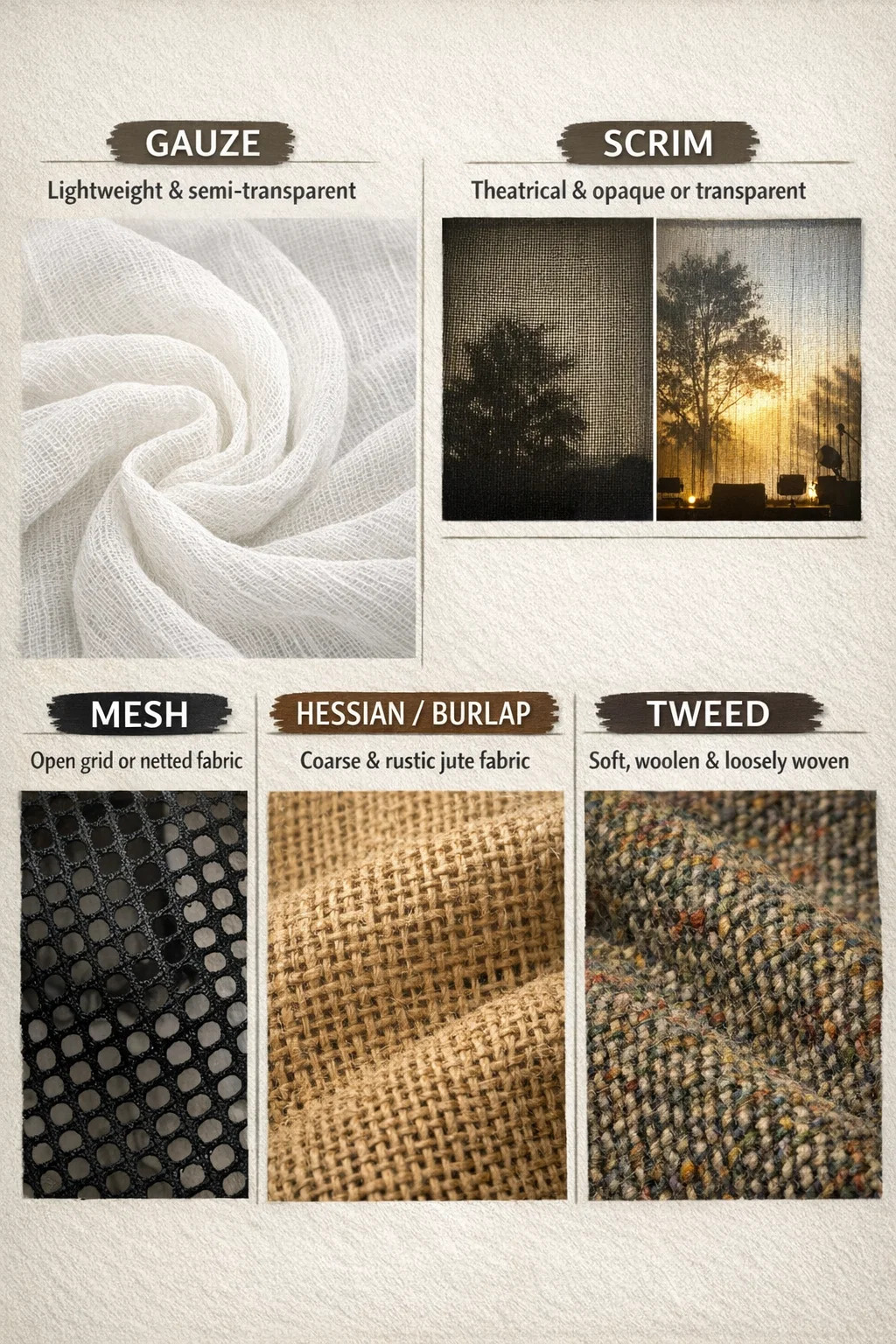 هنگام صحبت در مورد پارچه های بافته شده با "بافت شل و شکاف های بزرگ"، بسته به کاربرد و ظاهر، چندین اصطلاح بسیار خاص برای توصیف آنها وجود دارد.