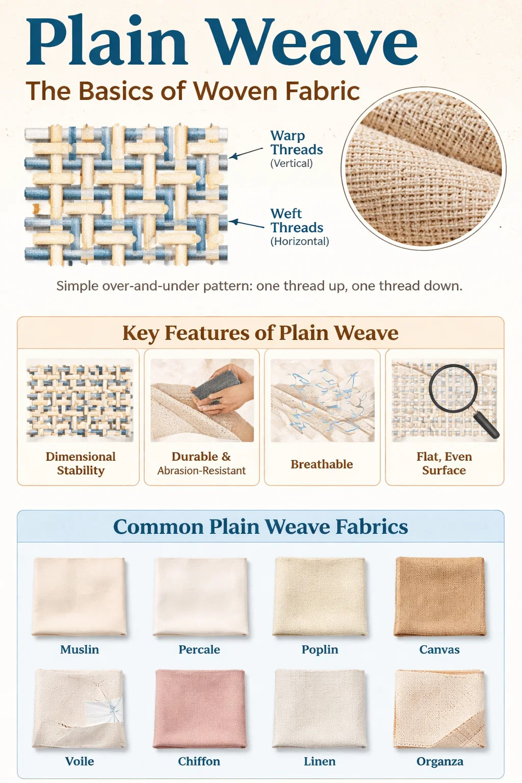 بافت ساده یک پارچه نیست - یک دسته ساختاری است که صدها نام پارچه متمایز را در بر می گیرد. تفاوت بین آنها از محتوای الیاف، تعداد نخ، تراکم نخ و مراحل تکمیلی ناشی می شود تا هر گونه تغییر در خود بافت.