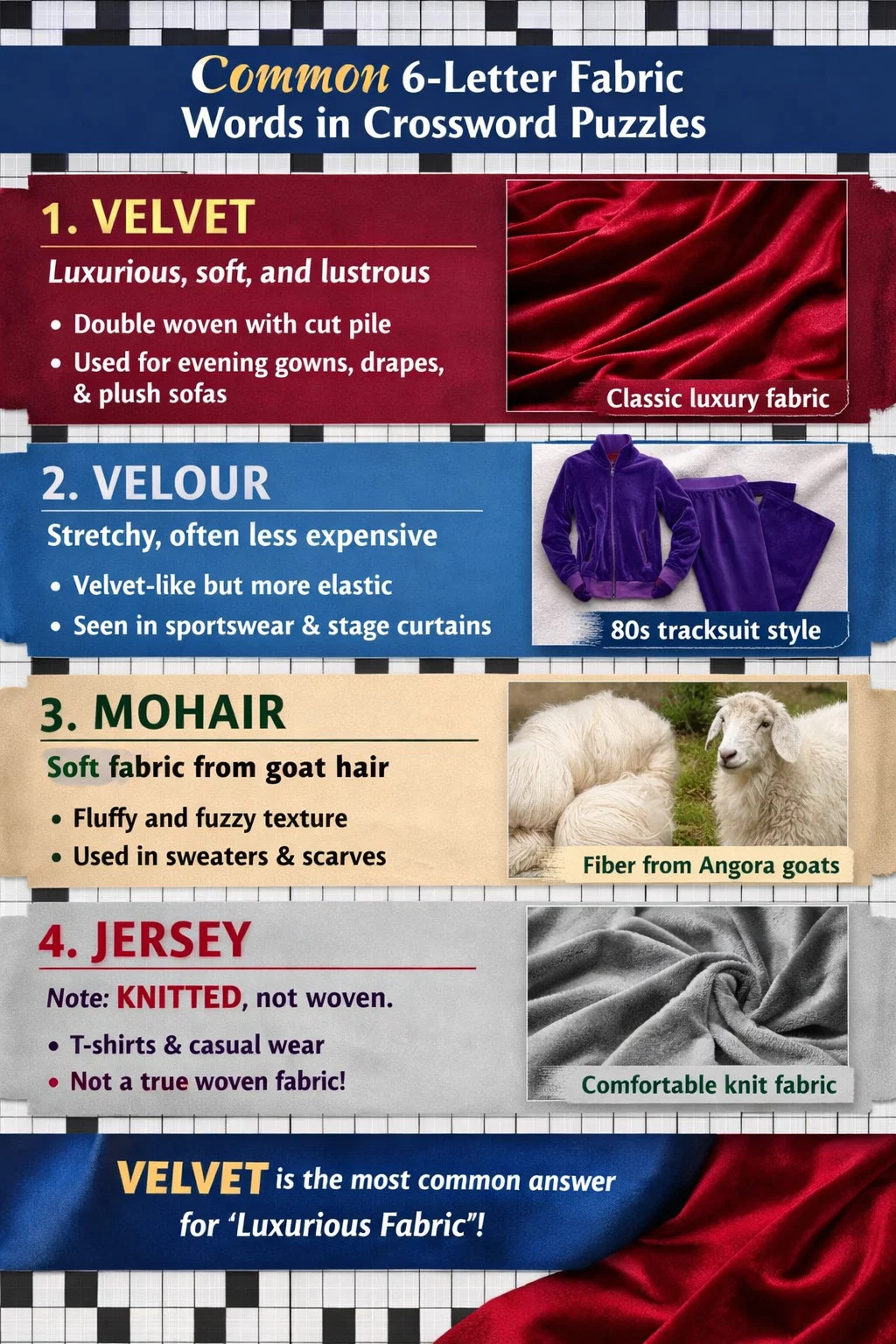 در جدول کلمات متقاطع، اگر سرنخ یک 6 حرفی "لوکس، نرم و مخملی" را توصیف کند. پارچه بافته شده ، کلاسیک ترین پاسخ VELVET است.