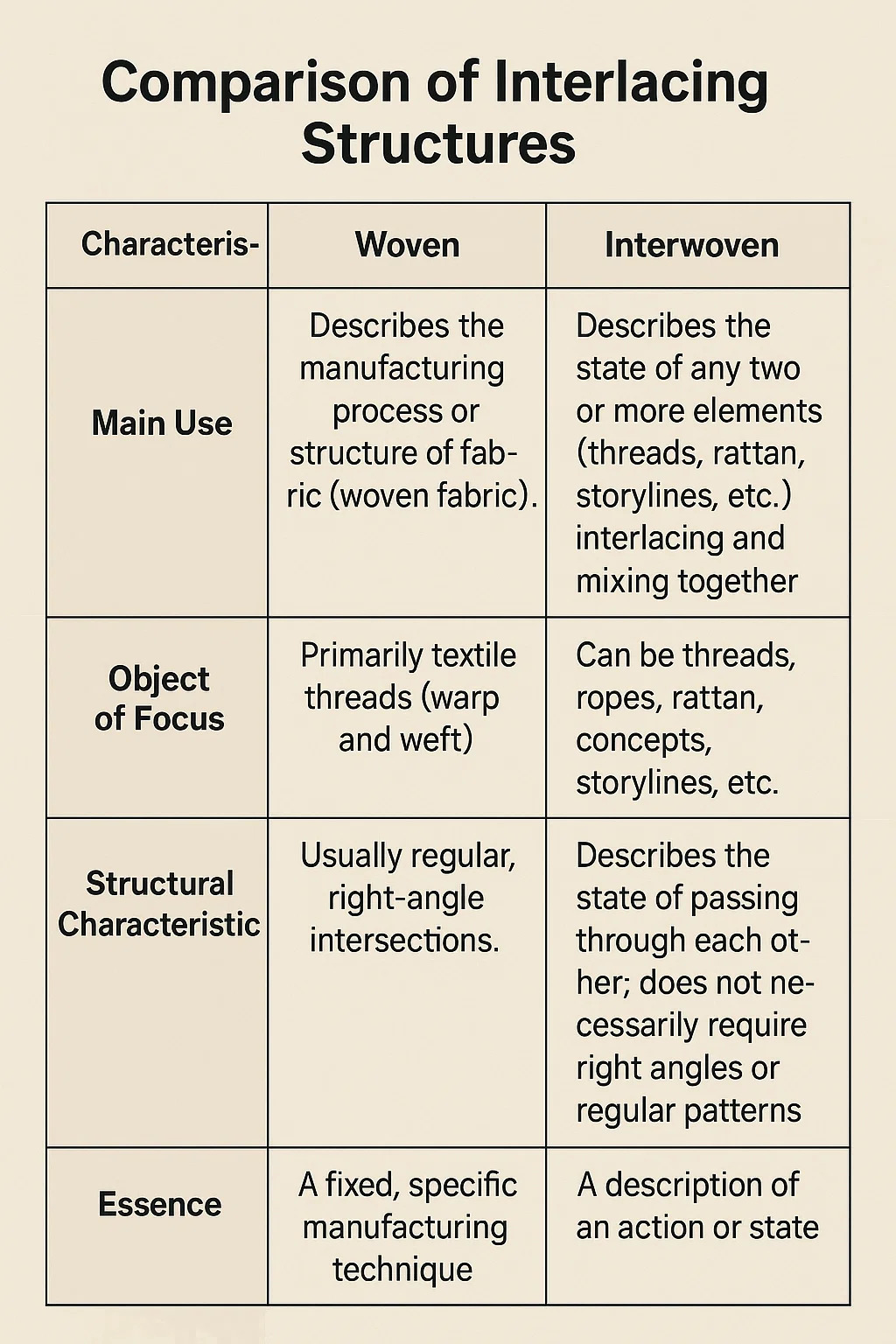 کلمات "بافته شده" و "در هم تنیده" از نظر معنی بسیار مشابه هستند، اما در هنگام توصیف نحوه اتصال نخ ها یا الیاف، تفاوت های ظریفی دارند.